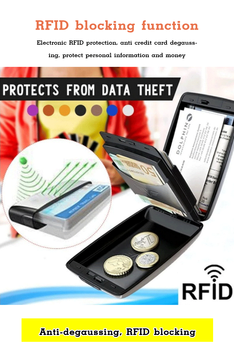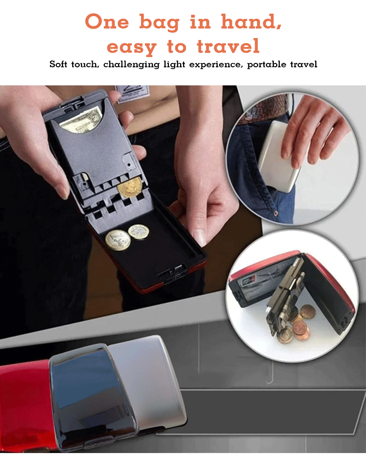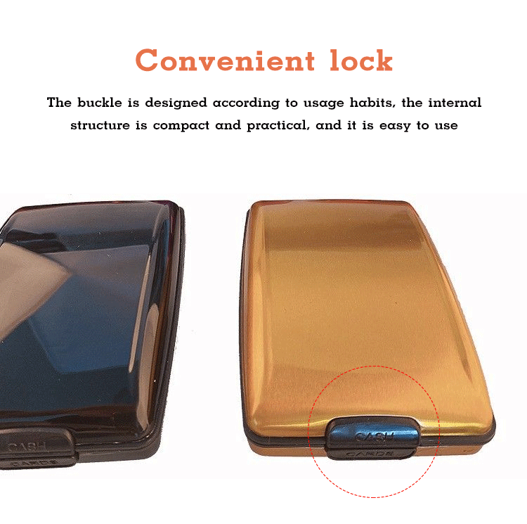 This business card case aluminum cardholder with High-quality aluminum alloy and Environmentally friendly plastic(ABS) clasp closure. blocking protection from all RFID scanners and readers.